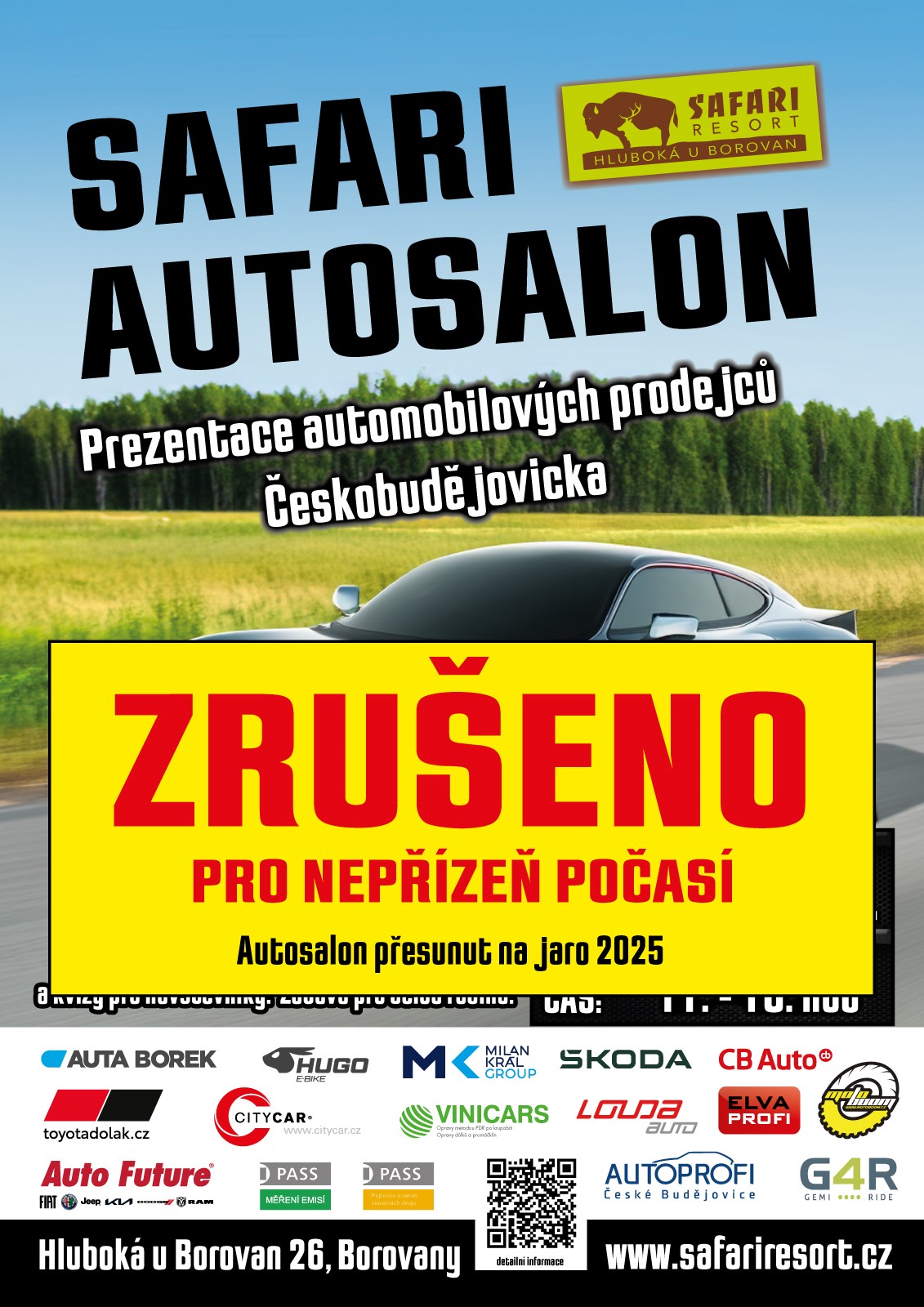 AKCE AUTOSALON V SAFARI SE RUŠÍ! Bohužel nám počasí nepřeje a musíme akci přesunout. Nový termín bude na jaro 2025! Děkujeme za pochopení a těšíme se na vás v lepších podmínkách. #AutosalonavSafari #ZměnaTermínu #Jaro2025 #DěkujemeZaPochopení #safariresort