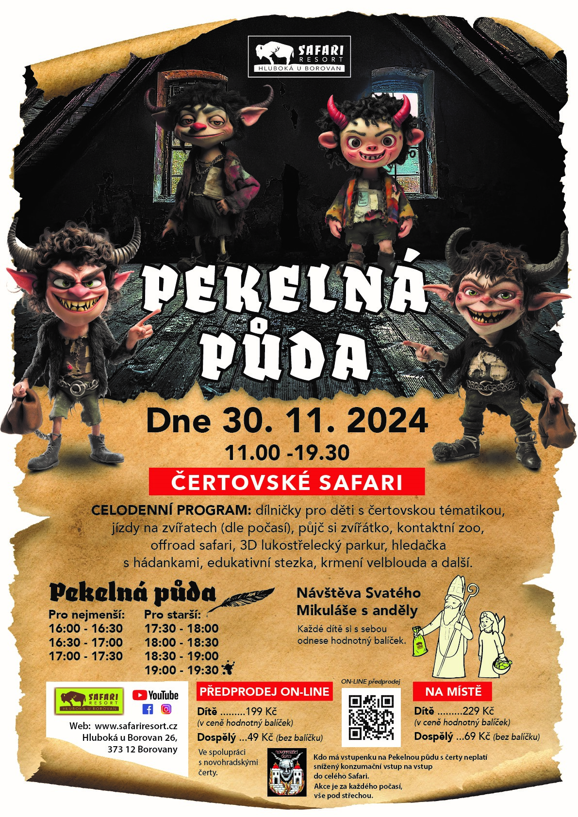Připravte se na jedinečný den plný čertovských zážitků! Pekelná půda s čerty vás přivítá a od 16:00 ožije pod taktovkou čertů. Hříšníci, pozor – možná vás už peklo nepustí!