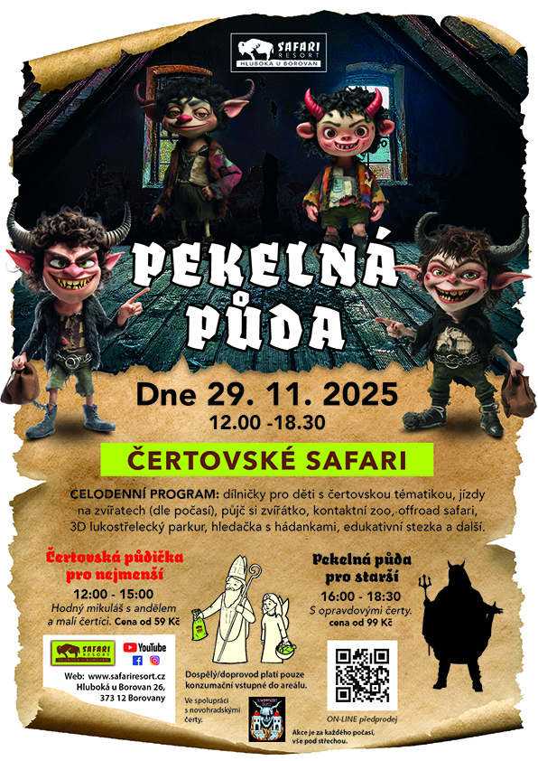 ČERTOVSKÉ ROJENÍ V SAFARI Sobota 29. listopadu 2025 | 12:00 - 18:30 Připravte se na pekelný zážitek pro celou rodinu!
