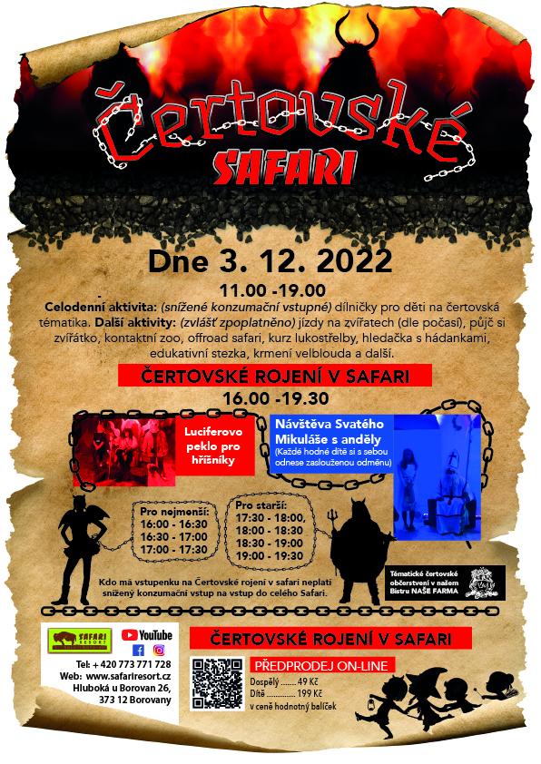 Čertovské rojení v Safari dne 3.12. od 11:00 hod. do 19:00 hod. Peklo s Luciferem a jeho pekelným doprovodem Vás přivítá a hříšníky si tam zanechá! Nebude chybět Mikulášská nadílka. Každé hodné dítě si s sebou odnese zaslouženou odměnu. Jak bude vypadat čertovské Safari a na co se můžete těšit? Od 16:00 hod. do 19:30 hod. Luciferová půda a mikulášská nadílka. Peklo s Luciferem a jeho pekelným doprovodem Vás přivítá a hříšníky si tam zanechá! Nebude chybět Mikulášská nadílka. Každé hodné dítě si s sebou odnese zaslouženou odměnu.