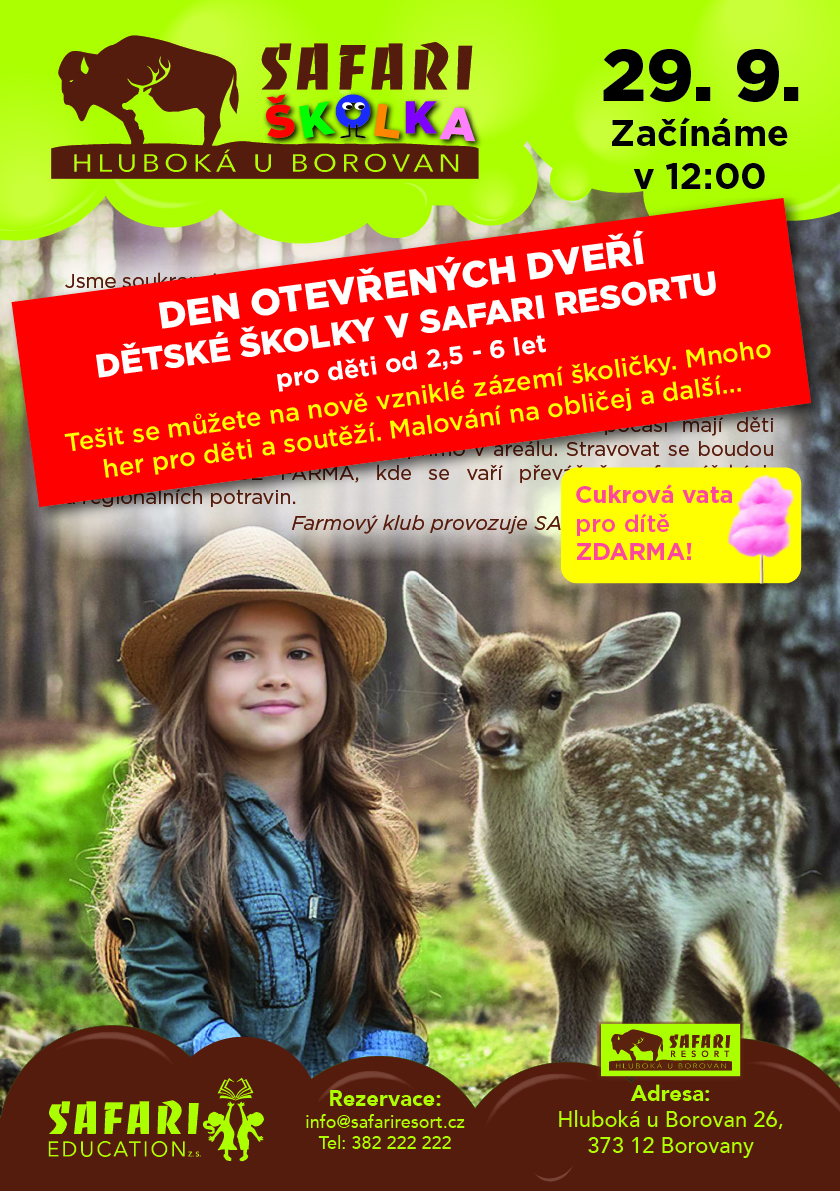 Děti se budou pohybovat primo mezi zvířátky v jejich přirozeném prostředí v SAFARI RESORTU, v jednom z největších přírodních areálu v Čechách. Důraz bude kladen na rozvoj správného vztahu k přírodě a přirozených dovedností dětí při hře, objevování a prozkoumávaní.