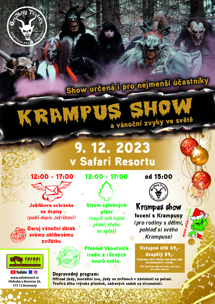 9.12.2023 12:00-17:00 Novinka v Safari Resortu! Přijede za vámi pekelná šlechta Großberg Teufel's, z.s. se svou Krampus show, která je určena pro všechny věkové kategorie, i pro ty nejmenší. Zároveň vám představíme i tradiční, vánoční zvyky, abychom Vás naladili na vánoční atmosféru.