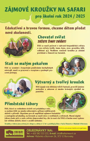 Kroužky a tábory jsou určeny pro chlapce a dívky 6-12 let a probíhají přímo v Safari Resortu od 15:30 v Hluboké U Borovan. Zájmové kroužky se budou konat, pokud se přihlásí alespoň 3 děti.