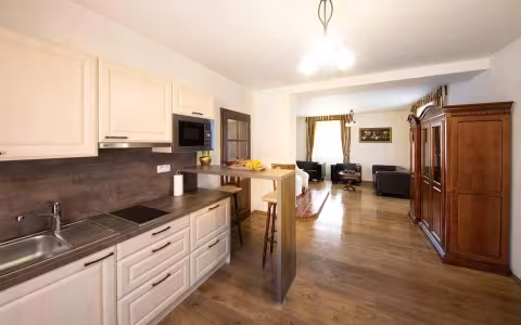Kompletně zařízené apartmány v zámeckém stylu s ručně vyřezávaným nábytkem. Dvou a čtyř lůžkové apartmány o rozloze od 26,98 m2 do 71,76 m2. Každý apartmán má vlastní koupelnu, obývací pokoj, vybavenou kuchyňku, ložnici, klimatizaci, trezor, SMART LED TV a WiFi zdarma. Kuchyňka je vybavena nádobím, sklokeramickou deskou, mikrovlnou troubou, lednicí s mrazákem, rychlovarnou konvicí. V koupelně jsou připraveny ručníky, kosmetika a vysoušeč vlasů. Můžete si vybrat z více variant podle vašich potřeb. Některé apartmány mají vlastní dřevěnou terasu s krásným výhledem na rybník a okolní přírodu. Jiné mají manželskou postel s nebesy v zámecké věžičce. Téměř všechny mají vanu.