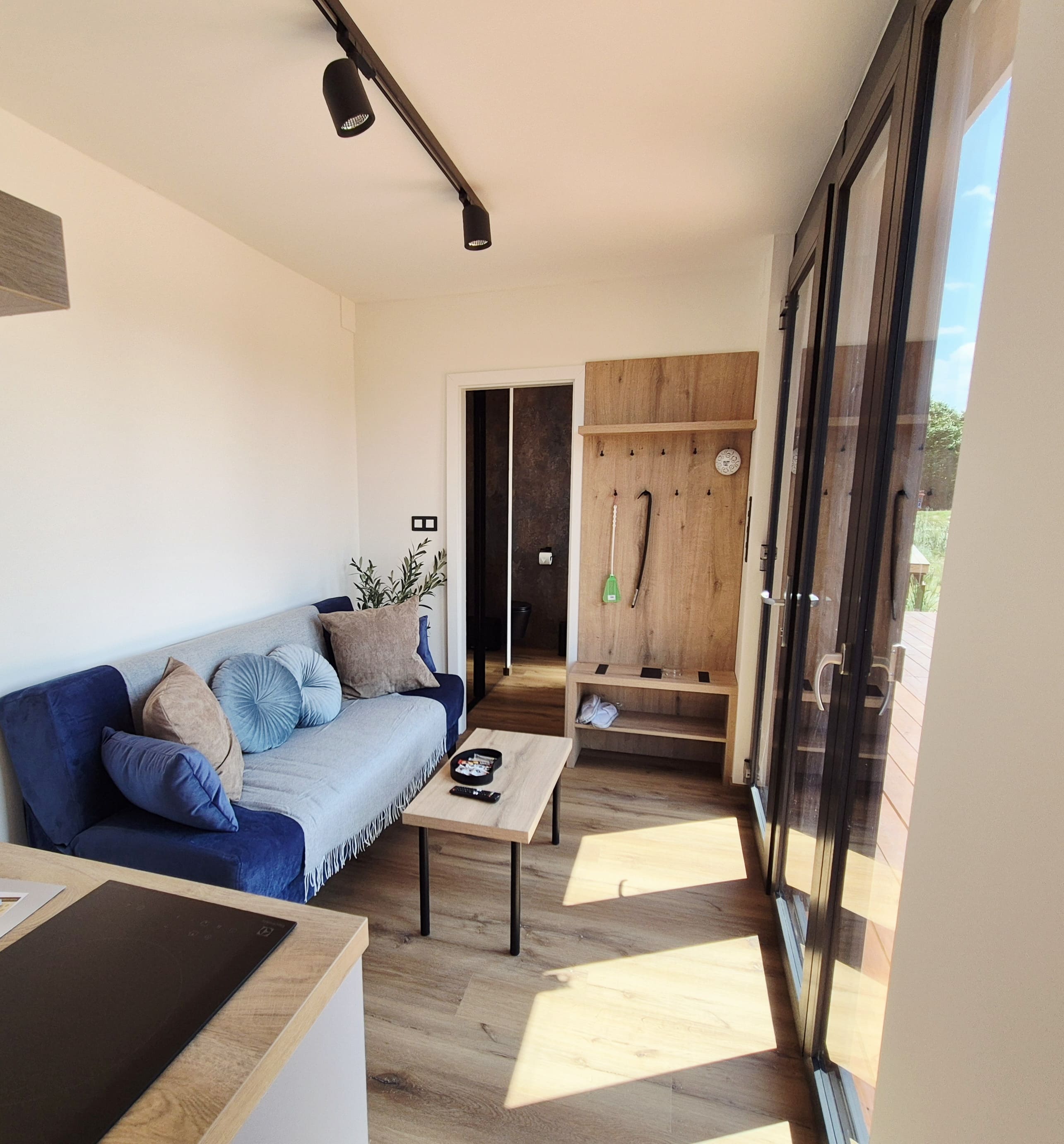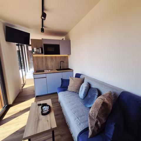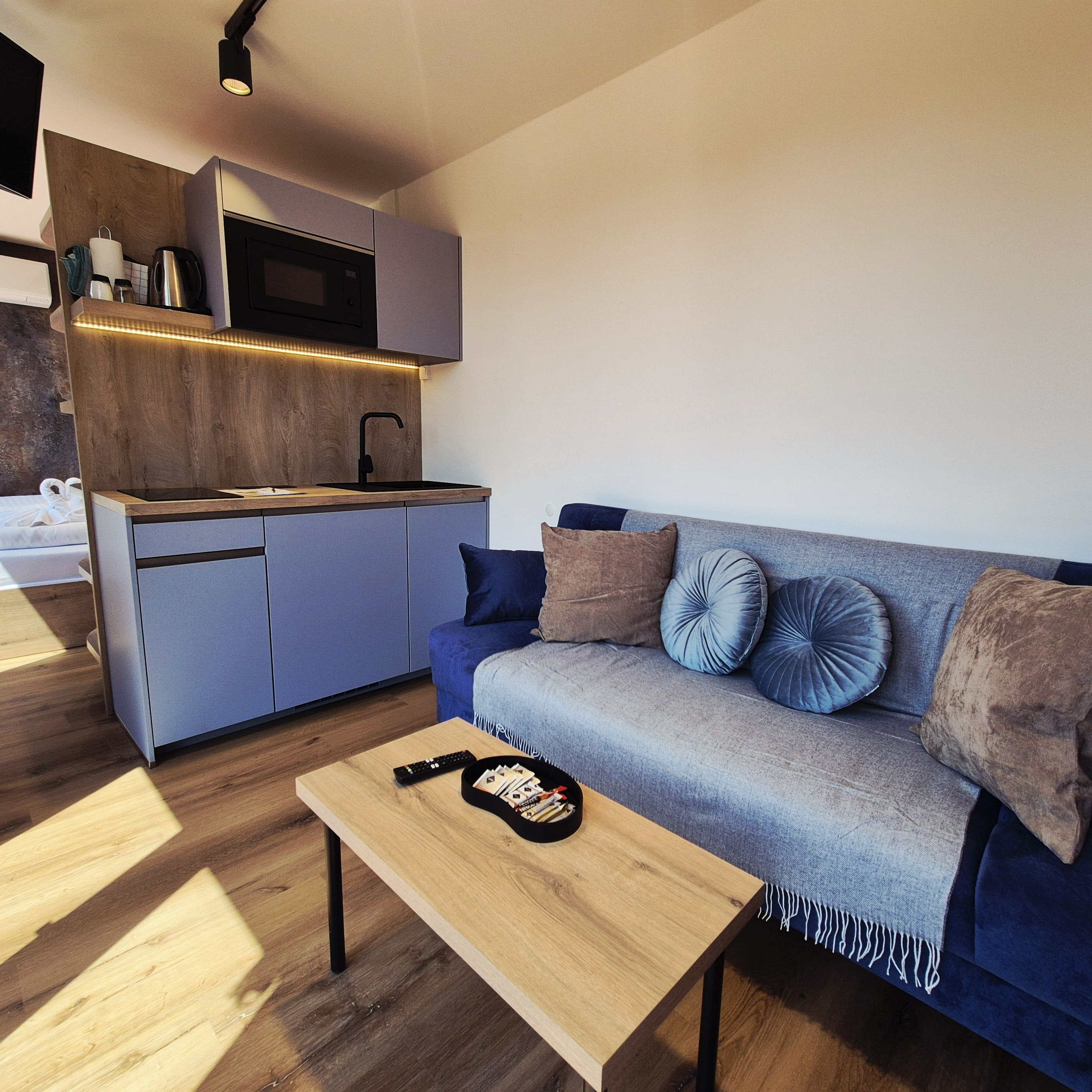 - plně vybavenou kuchyň s indukční deskou, pracovním stolem, mikrovlnnou troubou, lednicí a varnou konvicí,